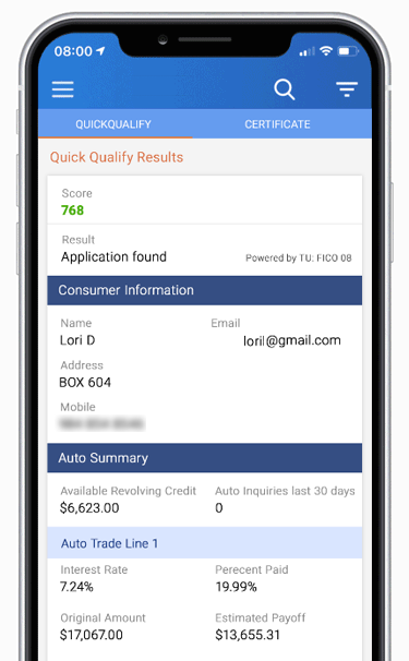 This application requires only the consumer’s name and address (no SSN or DOB) and has no impact on their credit file. In return, dealers are provided with a FICO score and full credit report. Your sales team will be empowered with the data they need to discuss qualified payment options based on current lender rates – leading to better customer conversations and experiences, and ultimately increased sales.